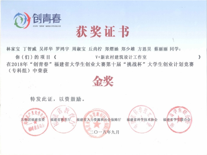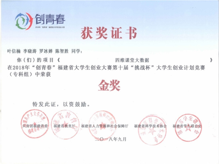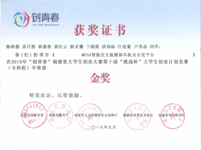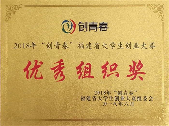 在2018年“创青春”第十届“挑战杯”福建省大学生创业大赛中,我校参赛项目荣获了3个金奖、3个银奖、8个铜奖和2个优秀奖的佳绩。我校也同时获得了优秀组织奖。
